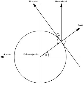 Diese Frage ist besonders wichtig für Seefahrer, die die Position ihres Schiffes auf dem Meer feststellen wollen. Die Abbildung 09 zeigt das Prinzip, wie man mit Hilfe einer solchen geometrischen Zeichnung den Breitengrad über die Winkelmessung ablesen