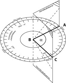 Dazu benutzt man einen Theodoliten. Man richtet das Fernrohr mit dem Fadenkreuz genau in den Scheitelpunkt des einen Objekts und liest den Winkelgrad auf dem Horizontalkreis ab. Dann stellt man das Femrohr auf das zweite Objekt ein, liest wieder die Winkel ab und hat in der Differenz beider Ablesungen den gesuchten Winkel. Dies ist