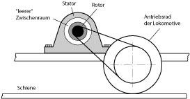 Denn ein Elektromotor besteht im Prinzip aus zwei Teilen (Abbildung 24); dem Stator, das ist der fest mit der Lokomotive verschraubte Teil, und dem Rotor, das ist der drehbare Teil, der sich am Stator dreht, um mit den Antriebsrädern verbunden ist. Sobald der Rotor zu rotieren beginnt, drehen sich die Räder mit und der schwere Zug setzt sich in Bewegung. Einige tausende Pferde wären notwendig, um solch ungeheure Kraft zu entwickeln.