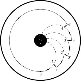 Eine metrische Linie als Bahn eines kräftefreien Körpers ist somit identisch mit dem Verlauf eines Lichtstrahls und einer Gravitationsfeldlinie. Dies ist die 3-fache Identität von Abschnitt 2, ohne welche die Innenwelttheorie nicht haltbar wäre. Metrische Linien verlaufen immer zur Weltmitte hin (vgl. Abbildung 23). Alle kräftefrei sich bewegenden Körper sowie die Lichtkorpuskeln bewegen sich somit auf metrischen Bahnen zur Weltmitte hin. Damit ein bewegter Körper eine solche Bahn verlässt, muss eine Kraft auf ihn einwirken, die ihn sozusagen aus dieser Bahn herauszieht. Diese Folgerung aus den vorhergehenden Abschnitten ist übrigens nichts anderes als das Galileische Trägheitsgesetz in transformierter Gestalt (siehe Abschnitt 1).