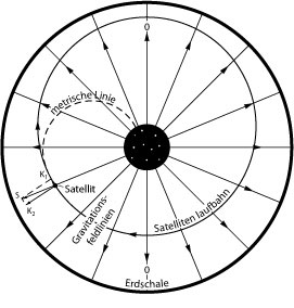 Abbildung 33 zeigt die Bahn eines exzentrischen Satelliten im Gravitationsfeld der Erdschale. Im gegensatz zu Abbildung 34 wo sich die höhe über die Erdschale nicht ändert. Der Satellit bewegt sich im Gravitationsfeld der Erdschale, dessen Feldlinien radial zu Weltmitte verlaufen (vgl. Abschnitt Schwere und Gravitation)
