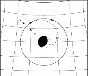 Die Zentrifugalkraft Z ist stets nach außen, also vom Mondmittelpunkt weg gerichtet. Die Gravitationskraft G, die vom Mond her auf den Satelliten wirkt, weist stets zum Mondmittelpunkt hin. Die nach außen gerichtete Zentrifugalkraft und die nach innen gerichtete Gravitationskraft müssen genau gleich groß sein, dann heben sie sich in ihrer Wirkung gegenseitig auf und das Raumschiff bewegt sich auf einer Kreisbahn um den Mond.