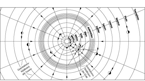 In der Kopernikanischen Betrachtungsweise ist die Sonne ein Zentralkörper, der von Satelliten, den Planeten umkreist werden. Der Sonne am nächsten kreist Merkur, dann folgt die Venus, die Erde (mit dem Erdmond), der Mars, die Asteroiden (wahrscheinlich ein zerstörter Planet), Jupiter, Saturn, Uranus, Neptun, Pluto und ein vermuteter, jedoch noch nicht nachgewiesener Planet, Transpluto genannt. Das sind also 11 Planeten, wenn man die Asteroiden mitzählt. Das Schema zeigt Abb. 35. Die Bahnradien sind nicht maßstäblich gezeichnet!