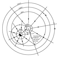 Alle Planeten bewegen sich so, dass ihre Bahnen die Gravitationsfeldlinien der Sonne nahezu senkrecht schneiden. Die Planetenbahnen werden durch das Kraftfeld der Sonne bestimmt.